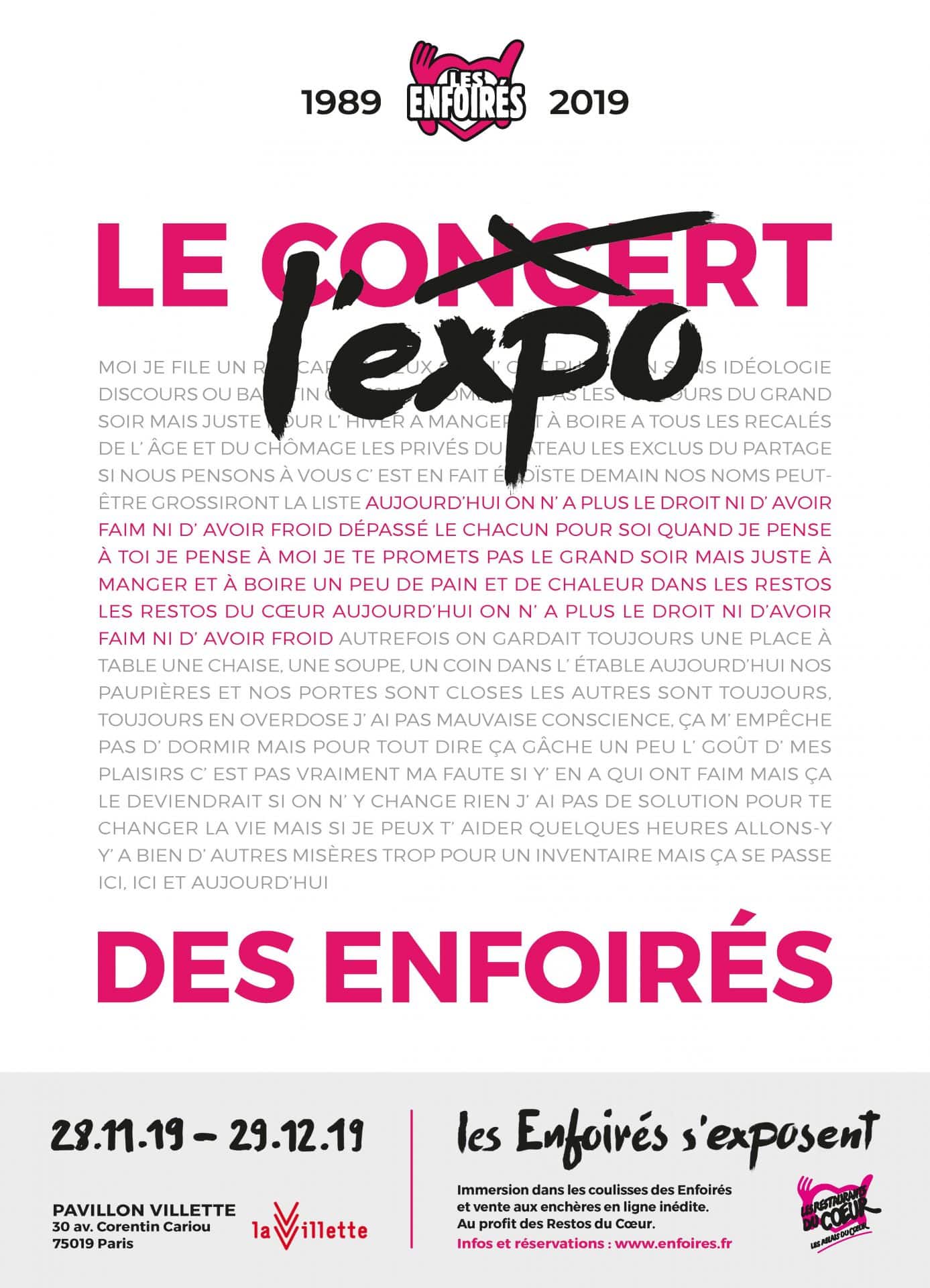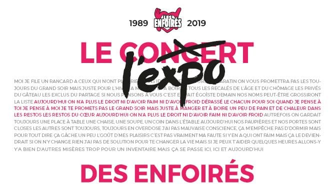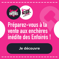 POUR LEURS 30 ANS, LES ENFOIRÉS S’EXPOSENT !Novembre 1989, novembre 2019… Cela fait 30 ans que la troupe des Enfoirés ne cesse de grandir et d’apporter son soutien aux Restos du Cœur. Pour les remercier eux, ceux qui se mobilisent chaque année pour offrir ce beau spectacle, et vous remercier vous, ceux qui sont aux rendez-vous au fil des années, Les Enfoirés s’exposent en vous faisant passer de l’autre côté du rideau, le temps d’une exposition inédite ! Du 28 novembre au 29 décembre 2019, rendez-vous au Pavillon Villette (Paris 19e) pour vous replonger dans l’histoire de cette troupe mythique et découvrir l’envers du décor ! Pour la première fois, les Enfoirés ouvrent leurs archives et dévoilent leurs secrets de fabrication pour une exposition qui conduira les visiteurs à partager l’ambiance des coulisses de leurs spectacles grâce à des images inédites. Ils y découvriront le travail de création et l‘organisation incroyable de cette troupe fidèle et impliquée, pénétreront dans les loges des artistes pleines de costumes, pour passer de l’autre côté de la scène et être au plus près de la vie de la troupe. En parallèle, pour prolonger l’expérience, une vente aux enchères inédite d’accessoires symboliques, de costumes marquants et d’éléments dédicacés par la troupe des Enfoirés sera organisée pendant la durée de cette exposition pour marquer ces 30 ans de mobilisation. Rendez-vous sur le site de Loisirs Enchères. => L’ensemble des bénéfices de ces événements sera reversé intégralement au profit des Restos du Cœur.